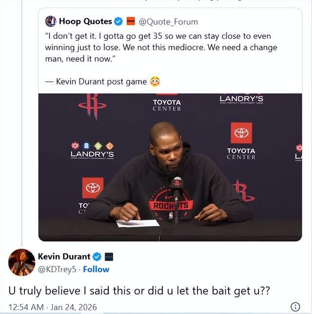休斯顿火箭队以122比128不敌费城76人队后,一则假借杜兰特名义发表的虚假言论开始流传。这则假言论的内容是:“我实在搞不懂。我必须拼尽全力砍下35分,才能让球队勉强咬住比分、保留赢球希望,可最后还是输了。我们本不该这么平庸的。球队必须做出改变,必须现在就改。”