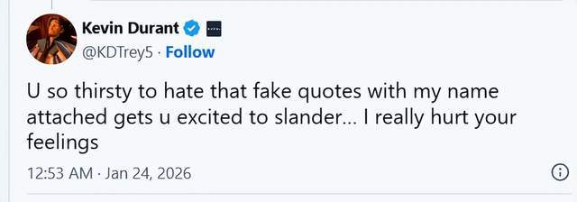 对此,杜兰特本人在社媒上回应球迷:“你是真的相信这话是我说的,还是单纯掉进了别人设的圈套?”